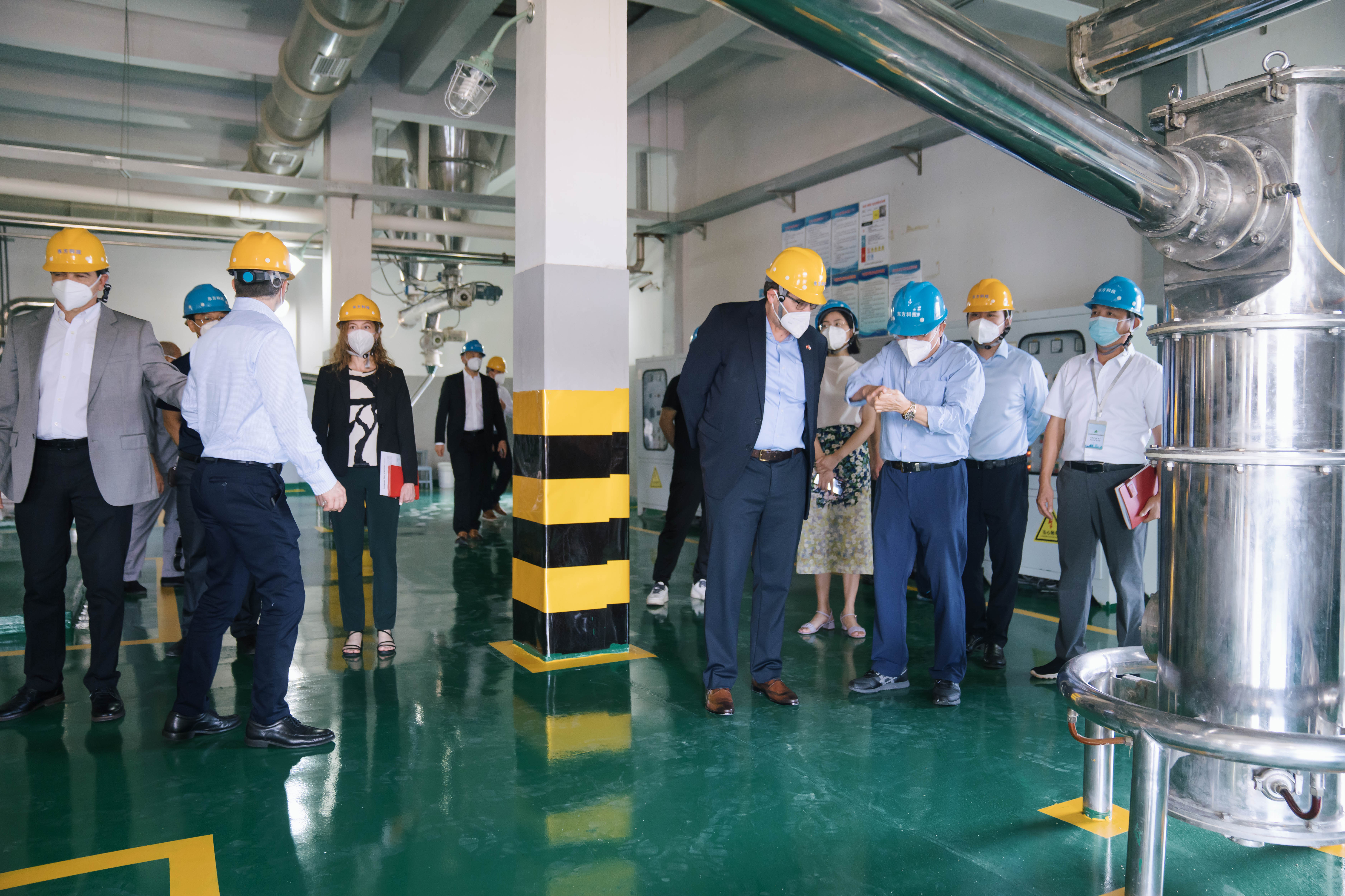 交流結(jié)束后,董事長(zhǎng)帶著智利大使及其大使館官員、ASOEX總經(jīng)理一行,深入公司生產(chǎn)、質(zhì)檢各部門進(jìn)行參觀。向各位展示了實(shí)驗(yàn)室用的先進(jìn)儀器和設(shè)備;車間生產(chǎn)用的一些設(shè)備更新與改造;比如全自動(dòng)包裝生產(chǎn)線、年產(chǎn)1400噸的氣流粉碎裝置、日產(chǎn)量12千升的懸浮劑設(shè)備、中型生化污水處理系統(tǒng)等